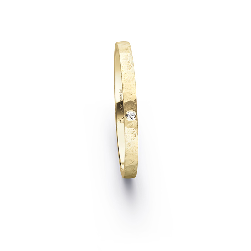 Die modernen Trauringe bestechen durch die außergewöhnliche Oberfläche, gestaltet im Hammerschlagdesign. Die handgemachten Gelbgold Eheringe messen eine Stärke von 1,2 mm und eine Breite von 2,0 mm und gehören damit zu den schmal gestalteten Modellen.
