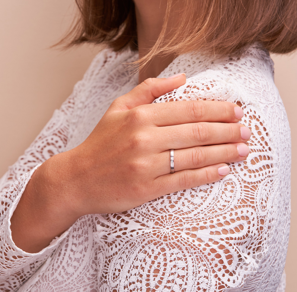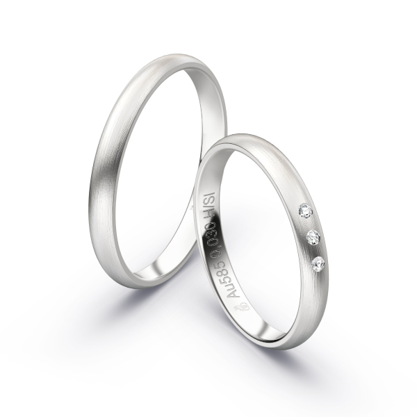 Diese zierlichen, ausdrucksstarken Eheringe aus Weißgold verzaubern auf den ersten Blick. Neben seiner hohen Wertbeständigkeit zeichnet sich dieses weiche Edelmetall auch durch seine ausgezeichnete Formbarkeit aus. So bringt die feine Längsmattierung der Oberfläche die helle, strahlende Farbe des Materials sowie die Form der Ringe besonders schön zur Geltung. Die exquisiten Trauringe mit 0,9 mm Stärke und 2,5 mm Breite fühlen sich dank der innenseitigen Bombierung angenehm und leicht an Ihrem Finger an. Egal ob Sie sich für 333er-, 585er- oder 750er Weißgold entscheiden, alle Legierungen sind natürlich nickelfrei und deshalb auch vollständig allergenfrei. Sie hätten gerne eine Spezialanfertigung für Ihre Eheringe? Lassen Sie sich von uns ein unverbindliches Angebot erstellen. Die Bestellung unseres kostenlosen Ringmaßes hilft Ihnen nicht nur, Ihre perfekte Ringgröße zu ermitteln, es berechtigt Sie auch zu einer kostenlosen Ringgrößenänderung innerhalb der ersten 100 Tage nach Erhalt Ihrer Ringe, sollten diese wider Erwarten nicht passen. Zur mattierten Oberfläche der Trauringe bilden funkelnde, weiße Diamanten einen faszinierenden Kontrast. Wir setzen Ihnen gerne drei dieser Edelsteine von je 0,01 Karat und 1,56 mm Durchmesser ein. Auch eine individuelle Steinwahl ist bei uns möglich. Liebevolle Handarbeit in Kombination mit modernster Technik ist für uns selbstverständlich – das gilt auch für die Gravur Ihrer Eheringe. MYTRAURINGstore bietet Ihnen den Gravurservice kostenfrei an.