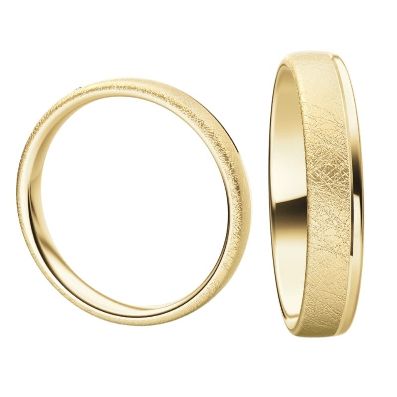 Einzigartige Gelbgold Eheringe mit 7 Diamanten und zwei Oberflächen - Polierung und Eismattierung