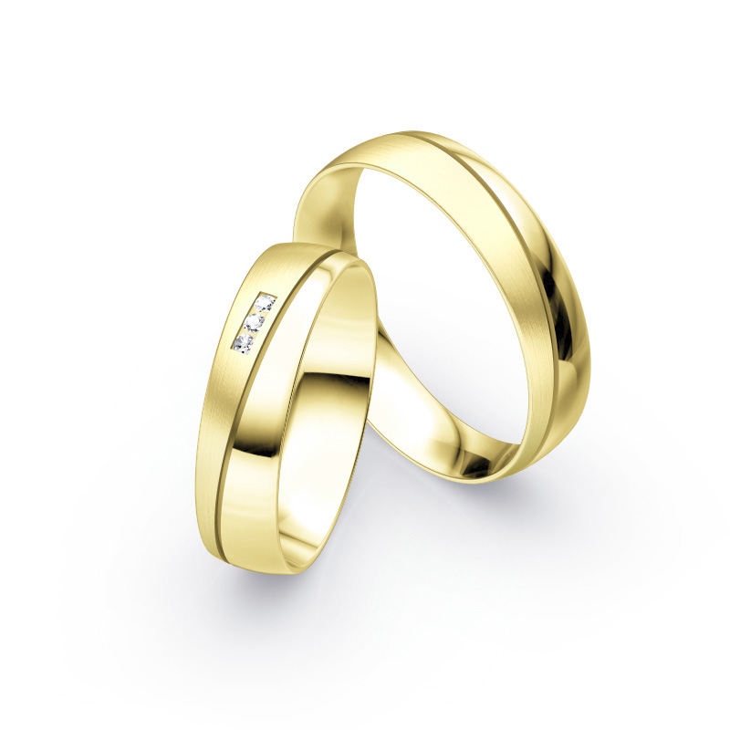 Formschöne Eheringe aus Gelbgold mit drei Diamanten in Vertiefung