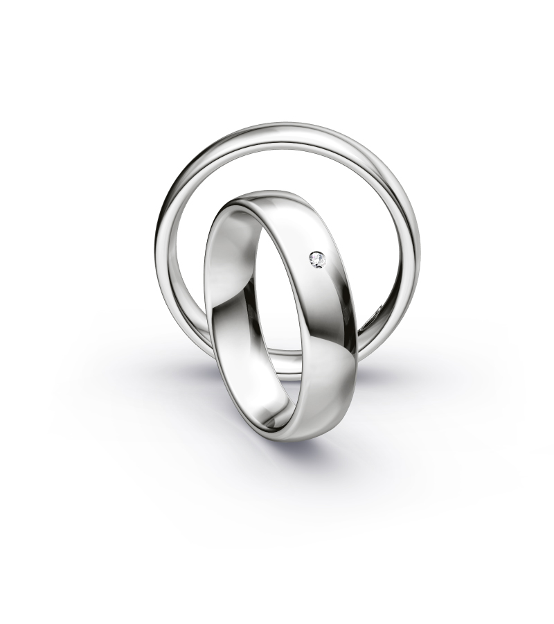 Formvollendete Trauringe aus 925 Silber mit polierter Oberfläche und rundem Stein