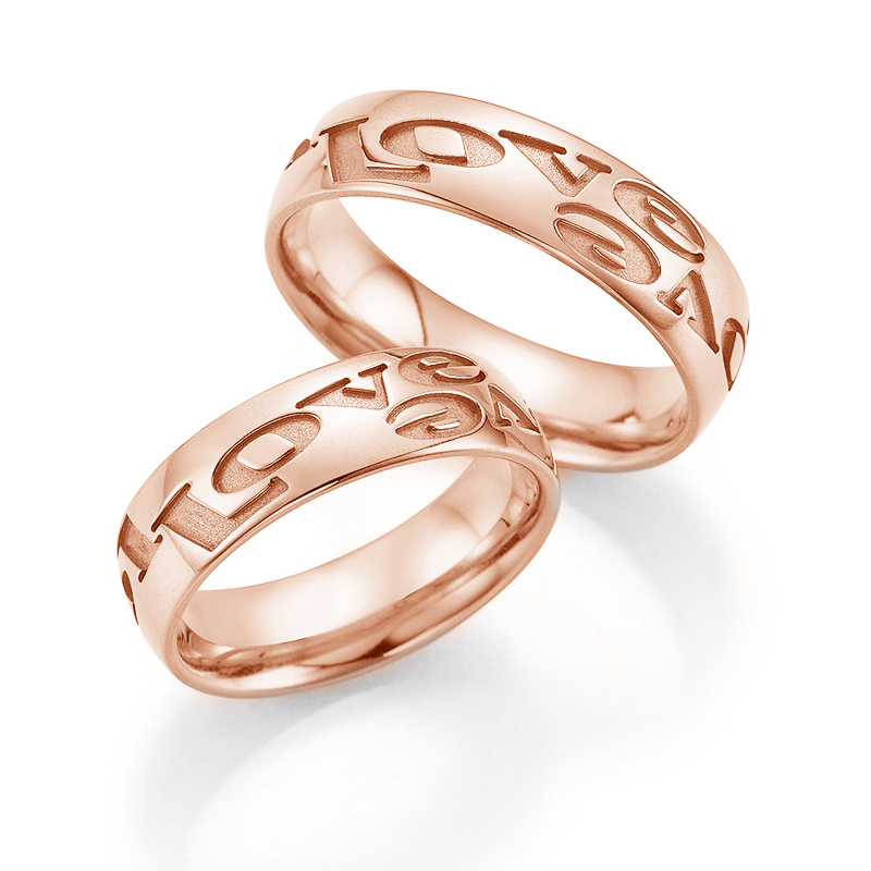 Interessante Rotgold Trauringe mit sandmattierten Vertiefungen in Love-Buchstabenform