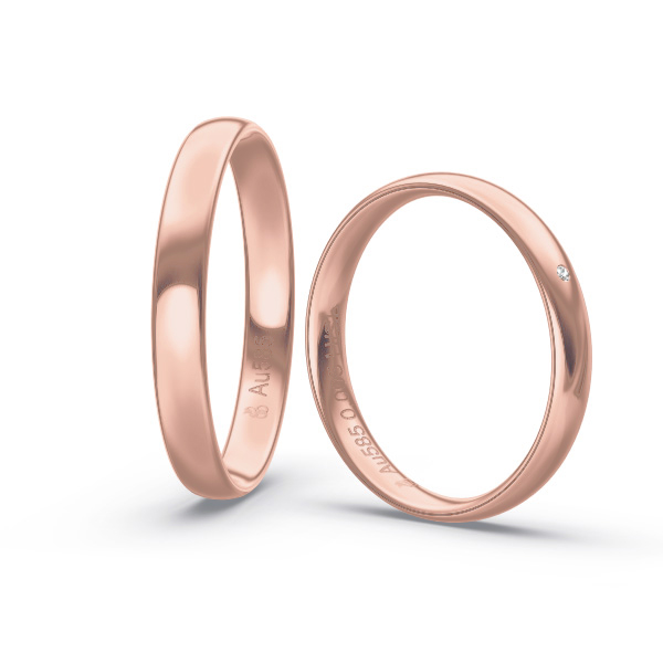Dieser Ring ist ein treuer Begleiter, an dem sich kein Brautpaar satt sehen kann. Er zeigt die Zusammengehörigkeit zweier Menschen mit Einfachheit aber mit Charme auf. Die Breite dieses Ringes ist mit 3 mm dezent bemessen, die Stärke liegt bei 0,9 mm. Dieses Ringpaar wird vom hellen und freundlichen Strahlen des rötlichen Goldes getragen. Das Design gibt sich mit seiner Polierung zurückhaltend. Aber diese Zurückhaltung schätzen viele Paare sehr. Denn beim näheren Betrachten übt sie einen bezaubernden Reiz aus. Das beliebte Roségold und die elegante Polierung vereinigen sich bei diesem Ringpaar und ergeben eine Ringkreation, die Raum und Zeit überdauert. Die passende Legierung darf noch ausgewählt werden. 375, 585 und 750 Roségold stehen zur Wahl, für welchen Goldton wollen Sie Ihren Ring Klassiker schmücken? Der Tragekomfort dieser Ringe ist besonders gut, eine leichte innenseitige Bombierung steht bei diesem nickelfreien Ringmodell dafür ein.