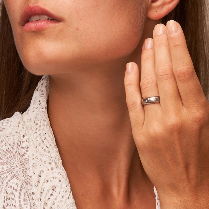 Die Fläche ist herrlich mattiert und weist einen leichten Hammerschlag auf, der von der Ringrundung etwas weicher gemacht wird und diese dezent unterstreicht. Die Oberfläche wirkt so wundervoll plastisch, sodass man sie berühren und das interessante Muster unter den Fingern fühlen möchte. Die Ringe werden in der Breite von 6 mm und der Stärke von 2.3 mm hergestellt. Das Schmuckstück des Damenrings ist der schöne Diamant im Brilliantschliff mit 0.03 Karat und 2 mm Durchmesser.