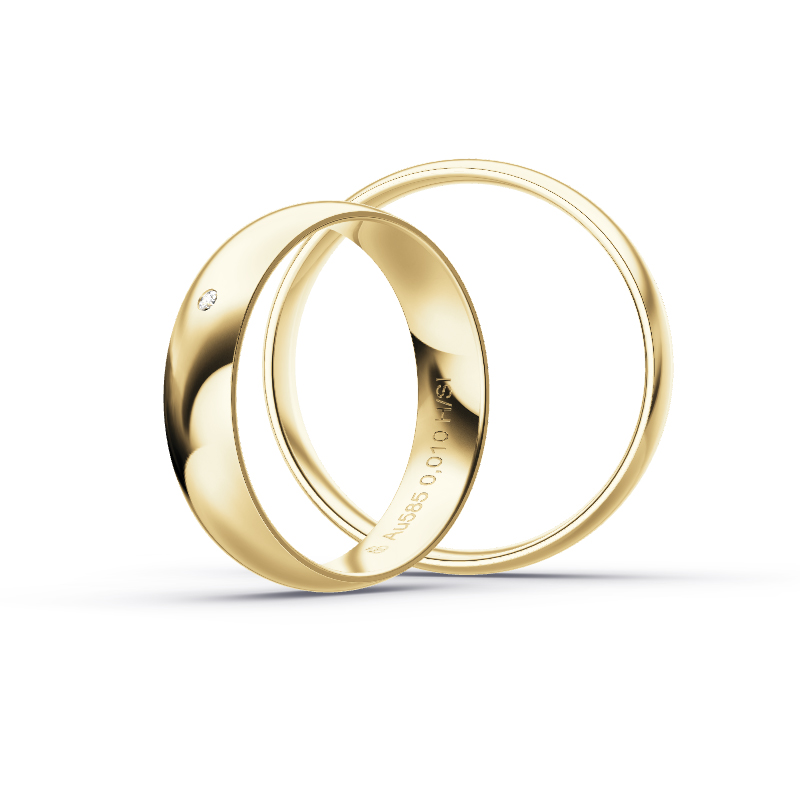 Der gelbe Schimmer des Goldes wirkt sehr harmonisch auf den Betrachter. Die Gestaltungsphilosophie dieser Ringe baut auf die wunderschöne Polierung auf. Denn diese Polierung macht aus dem Ringpaar, das eine Breite von 5 mm und eine Stärke von 0,9 mm hat, wahre goldene Schätze. Allerdings lassen die Aufnahmen von den polierten Trauringen in manchen Perspektiven eine Verdunklung zu sehen, die nur aufgrund der Fotografie entsteht und nicht zum Design der Ringe gehört. Auf die gestalterische Feinheit wurde bei diesen stilvollen Eheringen verzichtet, somit kann sich der Zauber der zeitlos schönen Eleganz voll entfalten. Das Brautpaar ist sich bereits sicher -das sind ihre Ringe! Welche Legierung sollten diese Eheringe dann besitzen? Zur Auswahl stehen 333, 585 und 750 Gelbgold. Dieses nickelfreie zeitlose Ringmodell zeichnet sich durch seine gute Hautverträglichkeit aus.