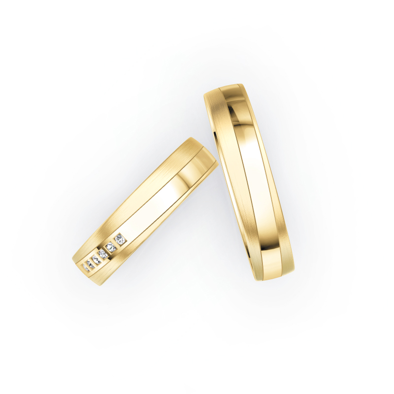 Das sonnige Strahlen des Gelbgoldes erfüllt dieses Ringpaar, das eine Breite von 4,5 mm und eine Stärke von 1,1 mm besitzt, mit Leben. Denn diese stilvollen Ringe bauen auf das klassische Material Gelbgold auf und haben außen eine flache Form. Bei den Legierungen darf gewählt werden, 333, 585 und 750 Gelbgold stehen zur Auswahl. Welche Legierung darf Ihr Ringpaar zieren? Die Gestaltungsphilosophie dieser Trauringe baut auf eine matte und eine glänzende Oberfläche auf, die sich gekonnt voneinander abheben und ein eindrucksvolles Design erzeugen. Der größte Teil der Oberfläche erscheit in einer sorgfältigen Längsmattierung, die durch einen breiten polierten Streifen unterbrochen wird, der mittig und leicht diagonal verläuft. Ein gutes Tragegefühl stellt sich dank einer leichten Bombierung auf der Innenseite der Ringe ein. Somit will kein Paar dieses nickelfreie Ringmodell jemals abnehmen.
