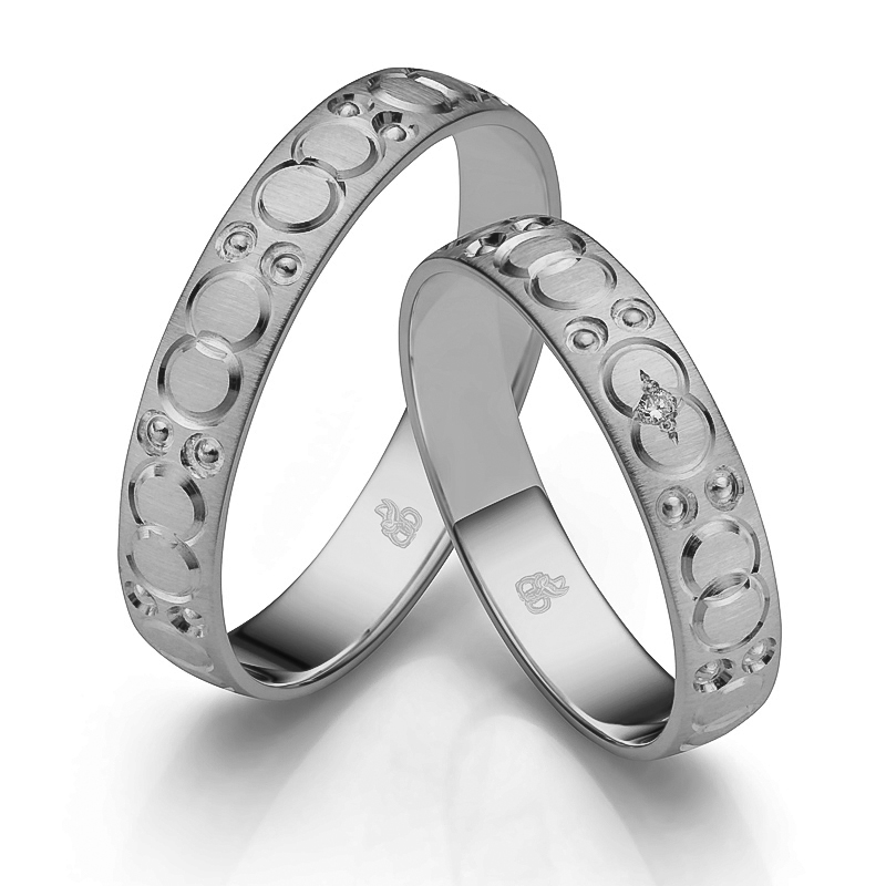 Zauberhafte Trauringe aus mattiertem Palladium 500 mit Kreisen und Diamanten