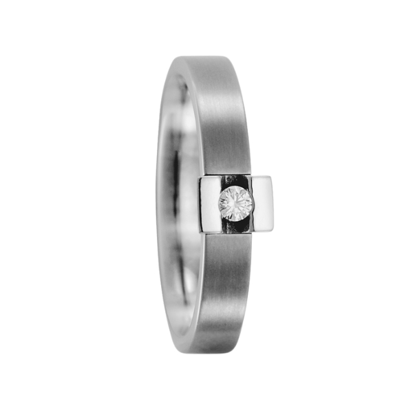 Außen hat der Antragsring eine flache Form mit geraden Rändern, die zusammen mit der schlichten Längsmattierung markant und edel wirken. Dieser Verlobungsring ist innen bombiert, was einen besonderen Tragekomfort ermöglicht. Er misst eine Breite von 3 mm und eine Dicke von 2 mm. Dieser Ring kann mit einem Diamanten von 0.05 Karat bestellt werden. Durch die interessante quadratische Fassung wird der große Diamant besonders gut zur Geltung gebracht. Diese Diamanten tragen die Abkürzung W/SI, welche ihre Qualität bezeugt.